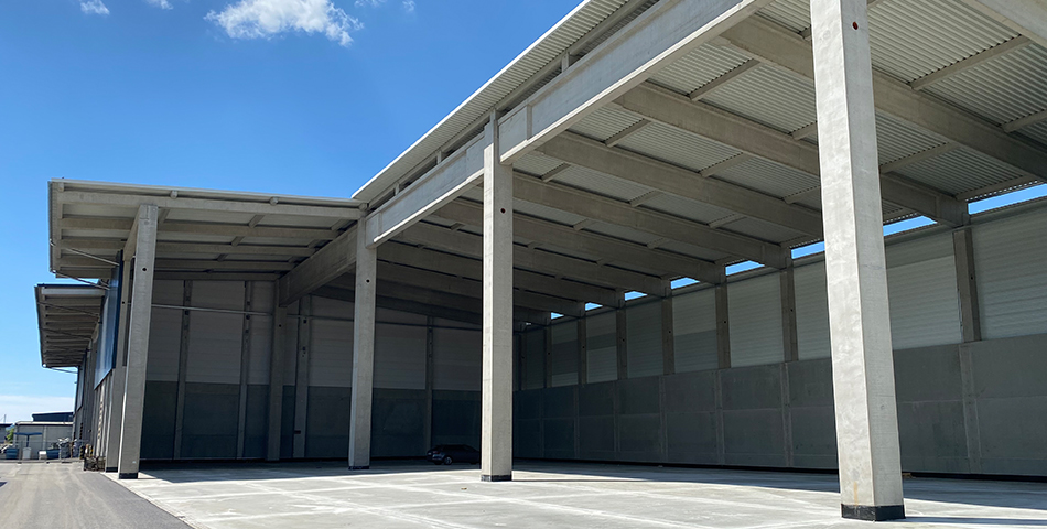 • Erstellung einer 18 m hohen Stahlbetonhalle mit 1850m² überdachter Fläche und großer Lagerkapazität