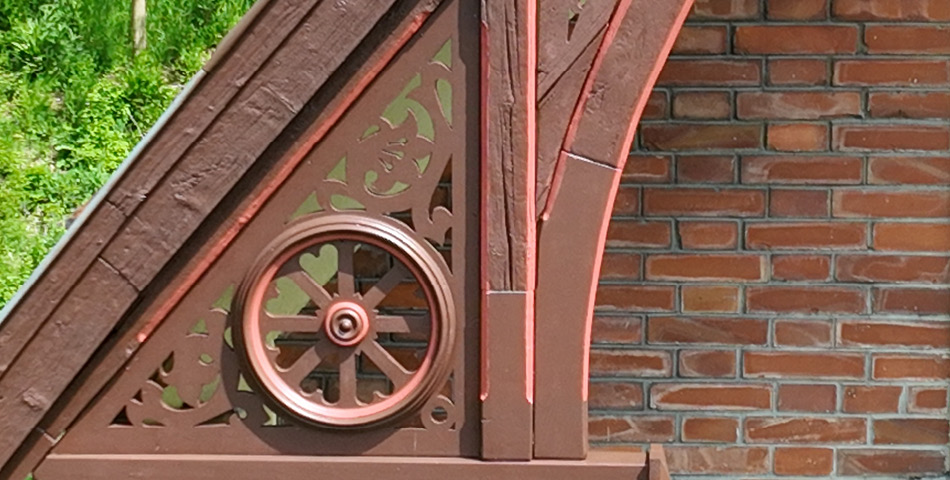 Linsmayer berichtet begeistert: „Als das Gerüst stand, konnte man sich die Schnitzereien endlich aus der Nähe anschauen – aufgrund der Lage des Gebäudes war das bisher nicht möglich. Die Zierräder und Zapfen sind unglaublich detailliert und aufwändig gemacht.“ Besonders stolz ist das Team auf die in Handarbeit gedrechselten Zierzapfen und das vollständig neu gefertigte Sonnenrad. Linsmayer bestätigt: „Man merkt, wie professionell und handwerklich talentiert die Mitarbeiter sind. Die Westseite wurde ganz hervorragend neu geschnitzt! Wir werden auch in den nächsten Jahren immer wieder mit HÖBEL zusammenarbeiten – als nächstes stehen die Verzierungen auf der Ostseite an. Aber eins nach dem anderen!“